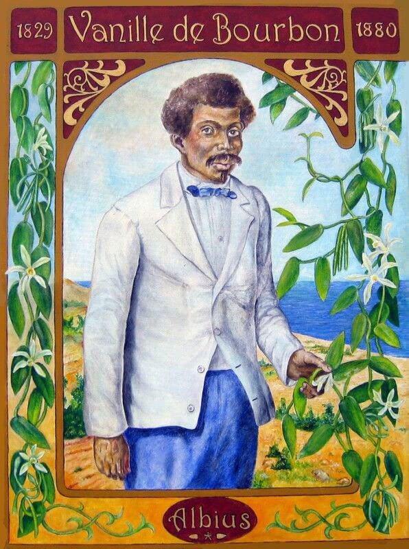 香莢蘭的花朵因自然授粉的機率約不到10%,所以人工授粉的技術是相當必要的,但是你知道當時香莢蘭傳入歐洲的時候,卻沒人知道要人工授粉嗎,1820年 法國殖民者將香莢蘭帶到留尼旺島和模里西斯栽培,在墨西哥以外的地方種植香草是很困難,在墨西哥香草是由蜜蜂授粉的,植物學家對蜜蜂如何授粉感到困惑,故事的主角艾德蒙(Edmond Albius​)一名出生於1829 年,於聖蘇珊娜(Sainte-Suzanne) 的孤兒,他的母親-梅莉絲死於難產,他從未見過父親-潘菲爾,後者在19 歲時去世,被他的情婦送到她兄弟-費雷奧爾·貝利爾-博蒙特(Bellier-Beaumont)的園區工作 ,主人他在島上以植物學和園藝方面的技能而聞名,當時的奴隸制度,艾德蒙從小就跟著主人從事著園藝管理的工作了解花卉、蔬菜和水果等,主人也對艾德蒙灌輸了對植物學的熱情,主人他收到了 20 株香香莢蘭,二十年後只有一株倖存下來,儘管它倖存下來,但始終沒有結果,博蒙特一直對園區不會結果的果樹,一直有著很大的困擾,艾德蒙時常會花了幾個小時研究種植園的植物樣本。